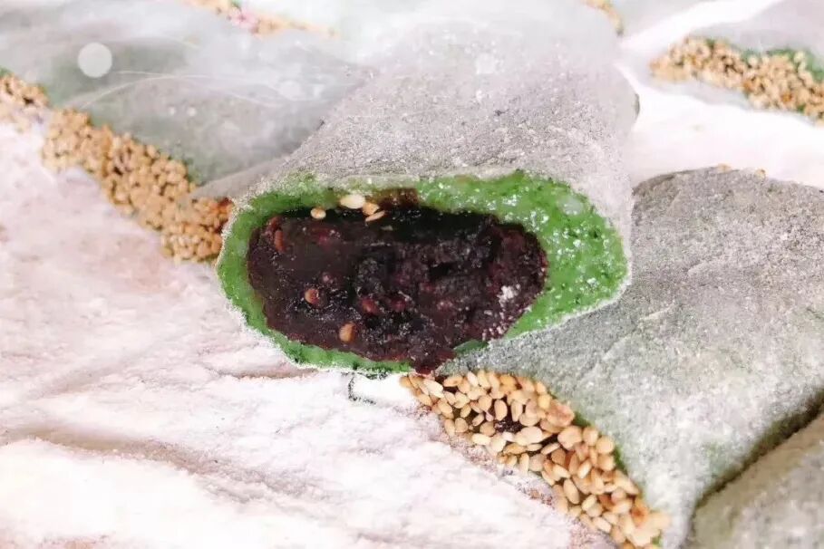 做青麻糍要在前一天就把糯米浸透,用石臼捣碎之后加入切碎的艾叶,摊平、擀薄之后包进豆沙馅,最后在外面蘸上芝麻和黄豆粉。