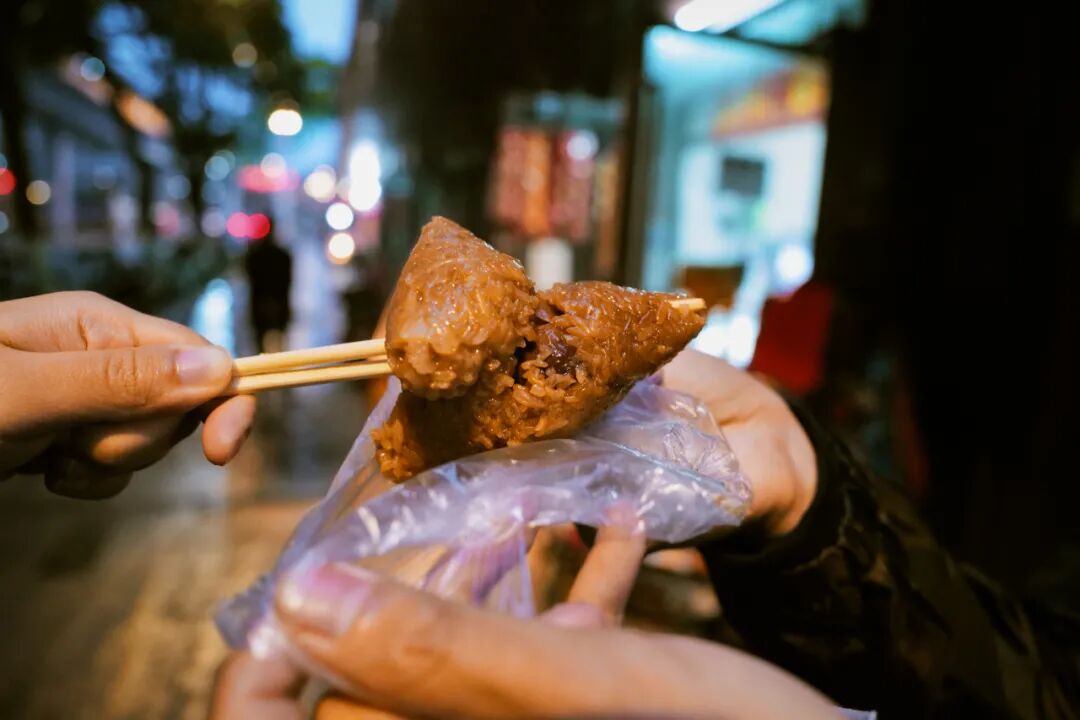 这里粽子的种类和浙江差不多,有甜口的红豆粽,也有经典的板栗肉粽。老板会帮你贴心地剥好,拿筷子插起来给你吃,料包得够不够紧实一看就知道了(图里这个就不够紧)。