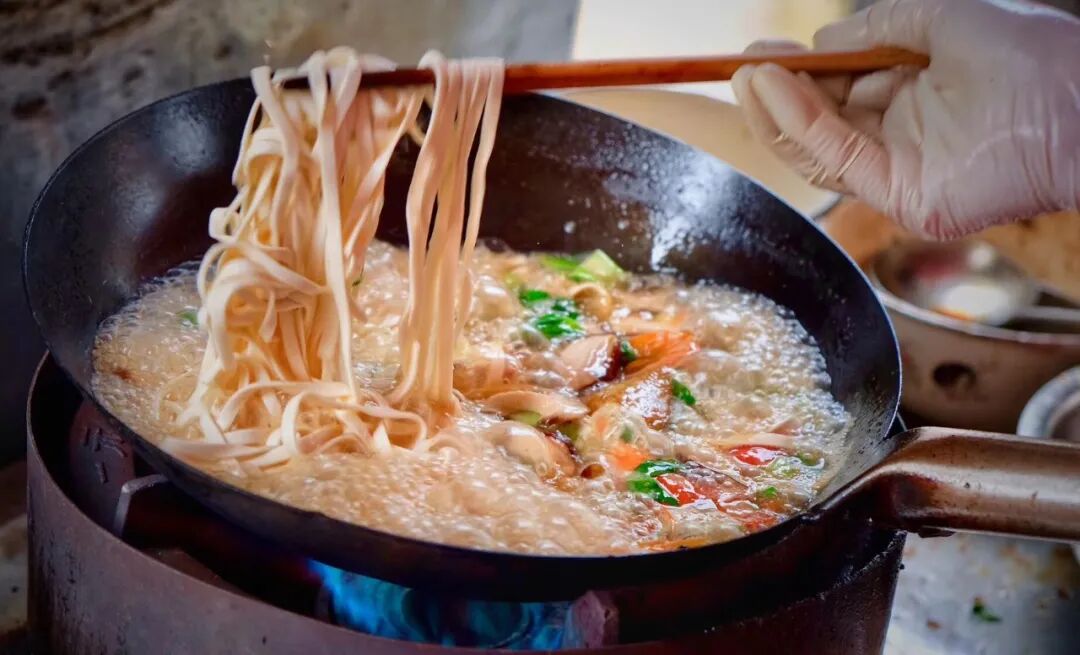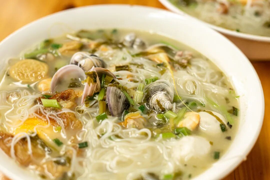 像是螃蟹、贝壳、鱼丸、海虾各选上几种,一碗海鲜丰盛到“溢出来”的老虎面,平均下来也就十来块钱,镇上的人尤其喜欢来他们家吃早饭,生意30年如一日的好。