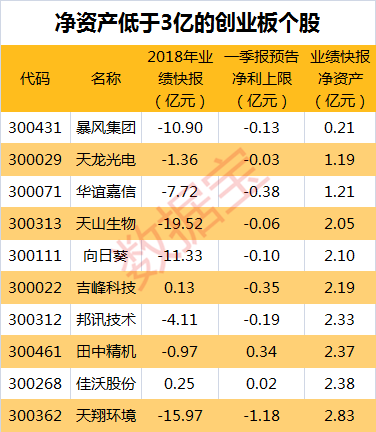 数据宝统计还发现,这些净资产较低的创业板个股,大部分经历了去年业绩爆雷,如暴风集团去年亏损超10亿、华谊嘉信亏损超7亿,天山生物、天翔环境、向日葵等都是去年业绩爆雷股。