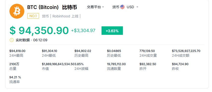 比特币首次突破94000美元/枚