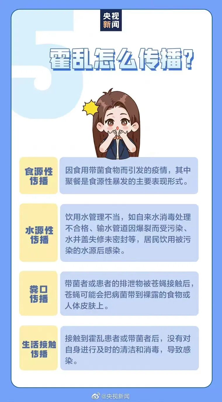 江门市中心医院感染科主任医师何纲表示,霍乱主要通过粪口途径传播,简单来说,就是病从口入,如食用了被污染的水、食物等。它不会通过空气进行传播,也不能通过皮肤直接传播,但如果皮肤沾染到霍乱弧菌,不注意卫生,不注意洗手,也有可能导致传染。
