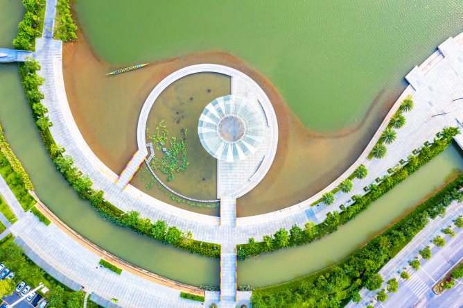 位于三山的西龙湿地公园,利用场地原有的沙滩地形及现有的棕榈科乔木,打造出亲水、亲鸟、不扰鸟的游憩、观鸟赏景节点——白鹭草滩。傍晚时分,金色落霞映照湖面,白鹭迎秋风翩翩起舞,宛若人间仙境。鹭影蹁跹,绚烂阳光遍染楼宇与苍翠之间。站立于落霞台上,便可将落日与江景尽收眼中,而这样不可多得的美景,就在三山!