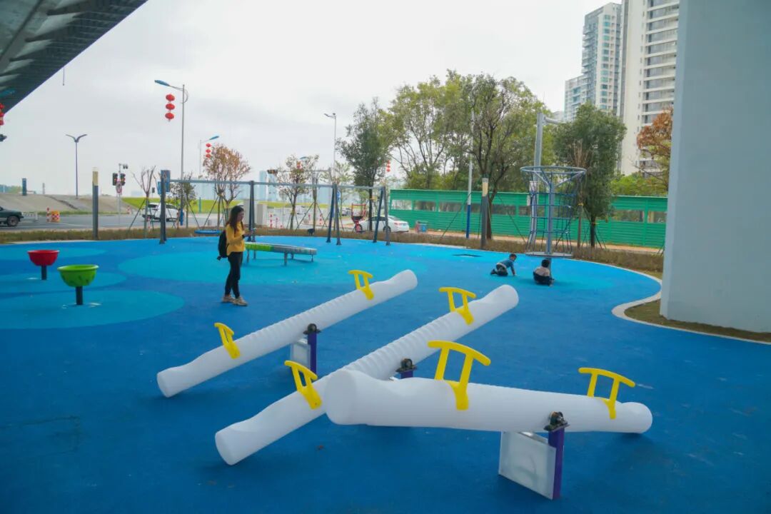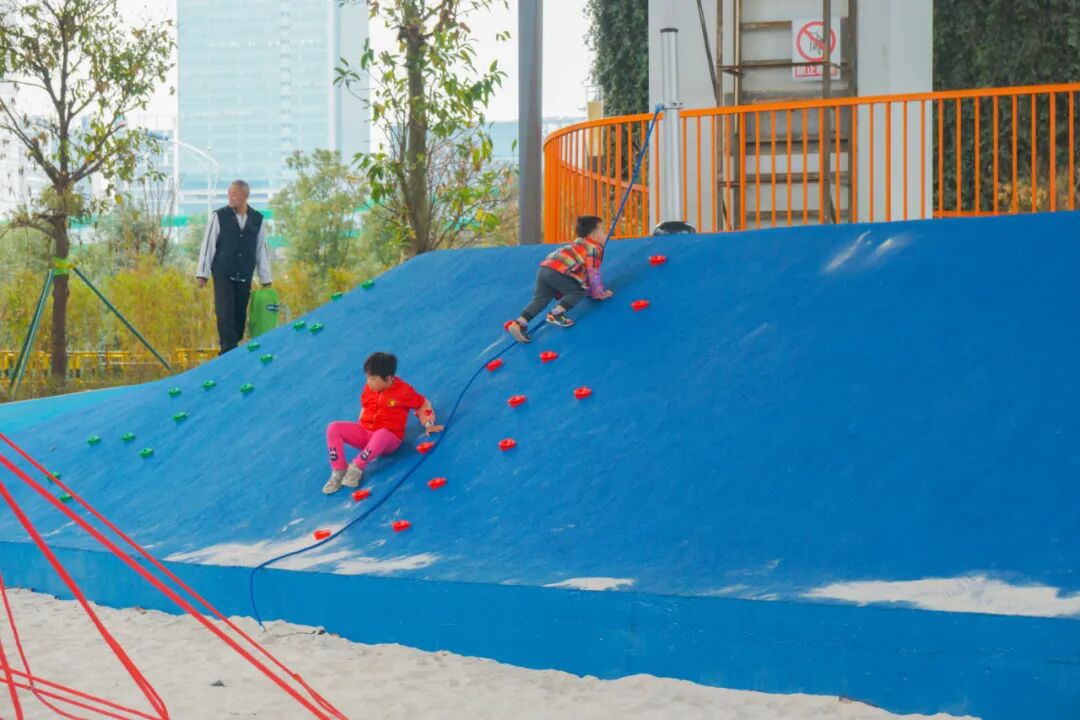 北侧以“运动”为主题,设置有攀爬网、弹跳垫、长链秋千、足球场、篮球场等游乐和运动设施,满足全年龄段人群的健身休闲需求。