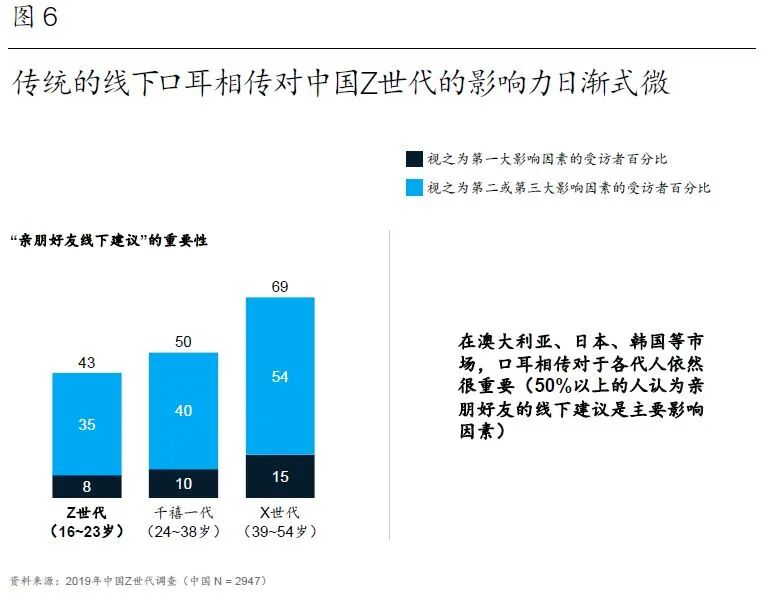 另一方面,传统的口耳相传或亲友线下推荐对年轻人的影响力日渐式微。Z世代受访者中只有43%将此视为三大影响因素之一,在X世代中为69%(图6)。