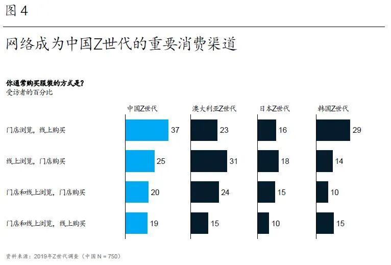 相比其他国家,中国Z世代更习惯于全渠道购物。以服装为例,近40%的中国Z世代消费者表示会去门店看实物,然后线上下单;其他国家/地区的Z世代中只有15%~30%会这么做。不过,只有不到20% 的中国Z世代消费者会同时在线上线下渠道浏览服装。这表明线上和线下渠道在中国Z世代全渠道体验中发挥着不同作用(图4)。
