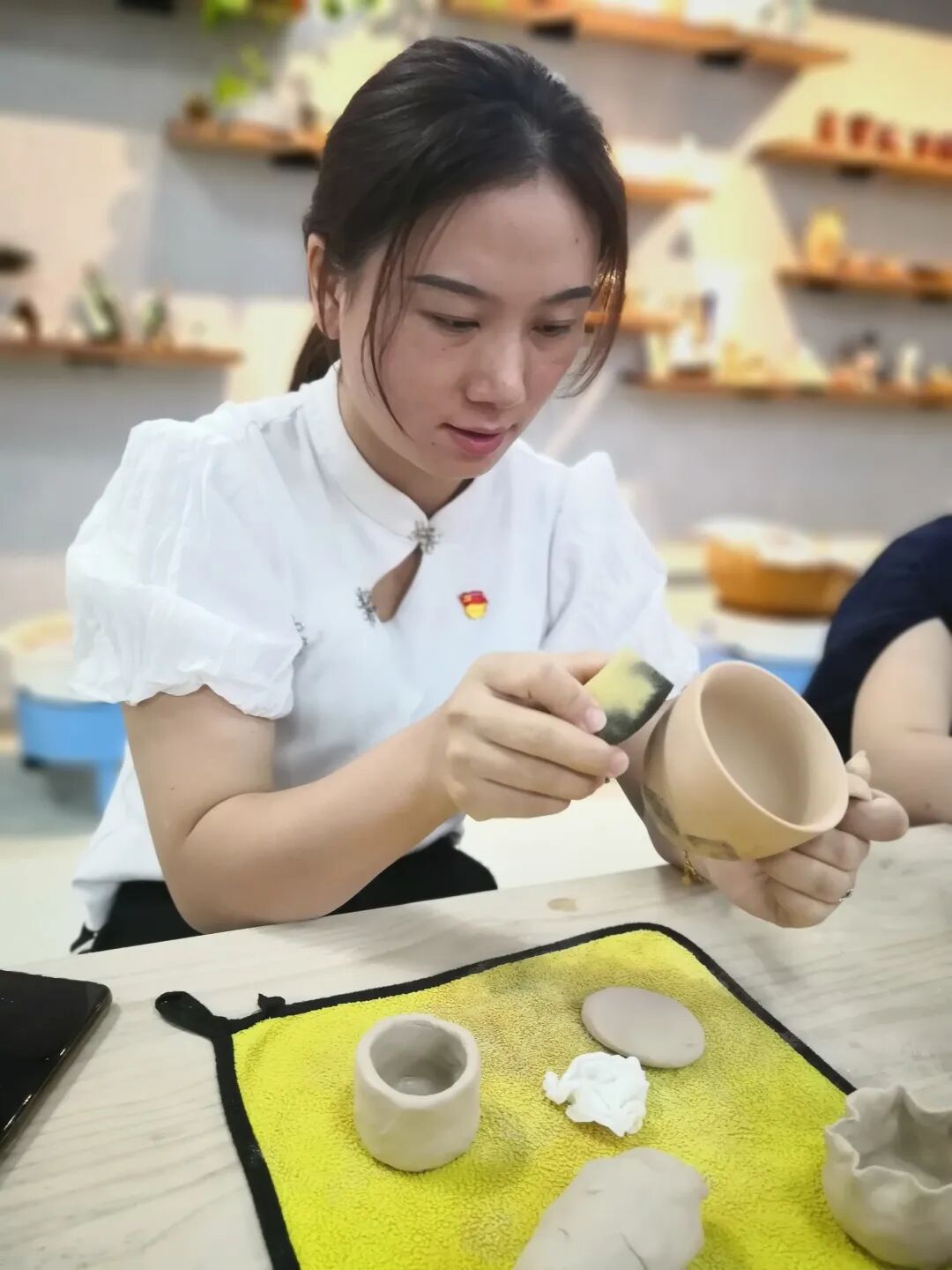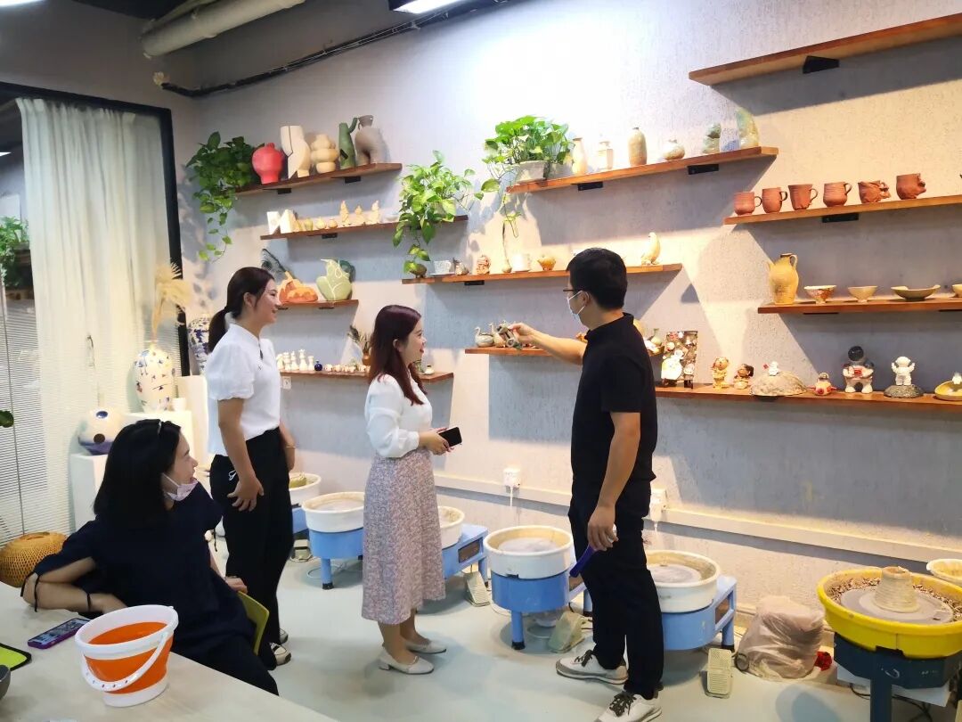 大家兴致勃勃体验捏塑、陶瓷绘画、拉坯等陶瓷艺术创作,全神贯注,沉浸在艺术创作带来的美好享受中。