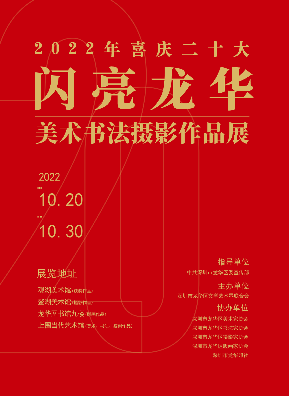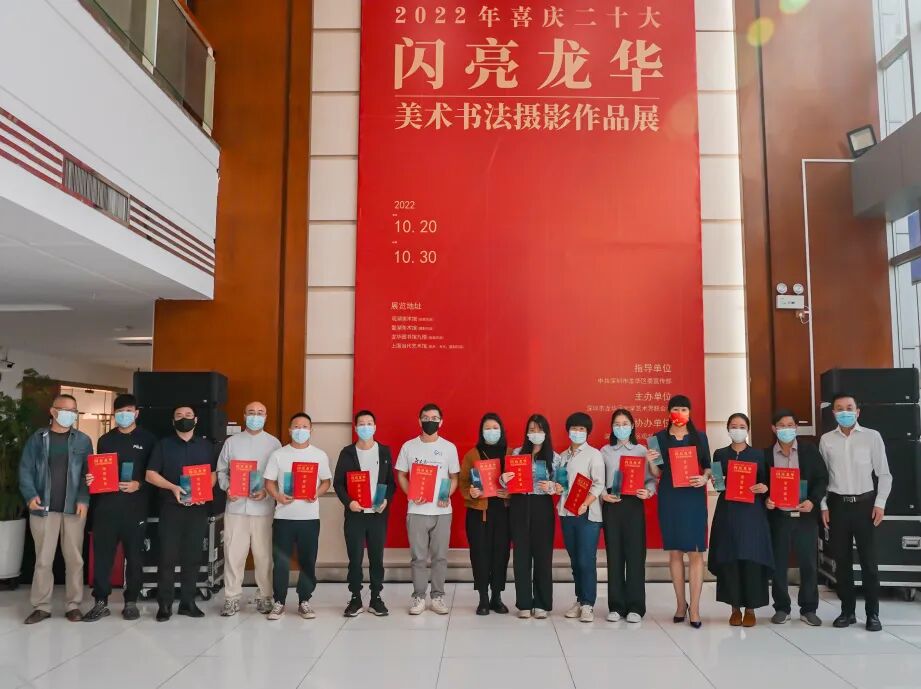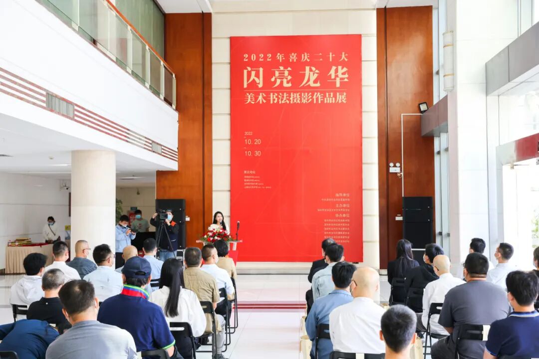 10月20日上午,由龙华区委宣传部指导,区文学艺术界联合会主办,区美术家、书法家、摄影家、版画家协会、龙华印社、观湖美术馆、鳌湖美术馆、上围当代艺术馆、龙华图书馆协办的2022年喜庆二十大“闪亮龙华”美术、书法、摄影作品展开幕式在观湖美术馆举行,市文联党组成员、专职副主席张晋文,区委常委、宣传部部长黄立敏,龙华区委宣传部负责人以及各界艺术家代表出席开幕式。