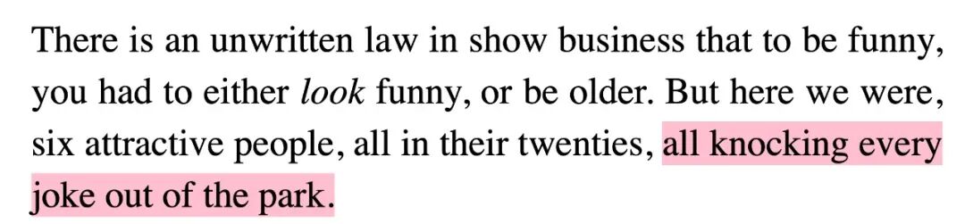 knock XX out of the park 是来自棒球的表达,在这里可以理解为每个包袱都能炸场(顺便学 bring the house down)。和前面的一段也呼应:All the jokes landed. We finished to thunderous applause.
