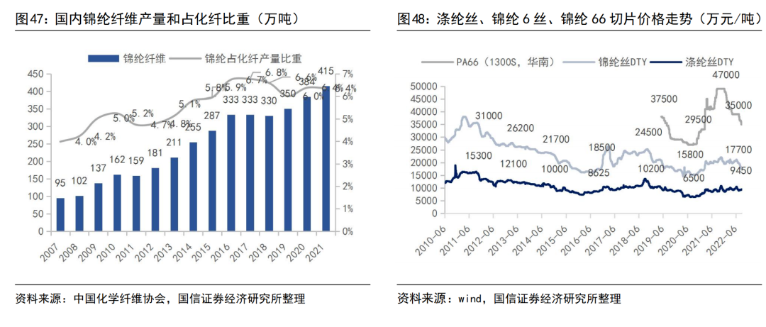 从产品结构看,锦纶纤维分为锦纶6、锦纶66、锦纶610、锦纶56等,其中锦纶66产量约39万吨(约4万吨民用丝),锦纶6产量约318万吨(约223万吨民用丝),具体将在“锦纶66”章节中进一步分析。