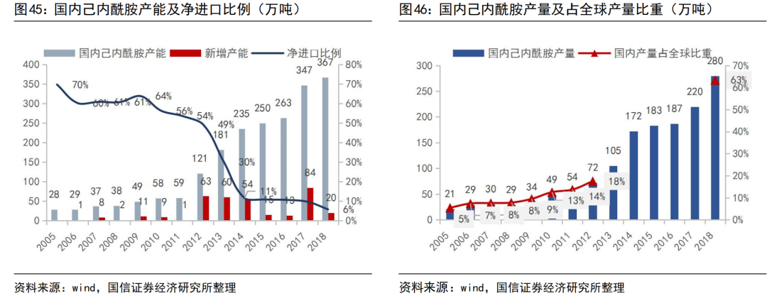 总结复盘尼龙6原材料国产化历程,在己内酰胺技术突破后3年内国内产能增长298%,尼龙6丝价格下降31%,5年内尼龙面料出口份额从10%提升至26%(相对滞后1-2年),产业链成熟从而驱动终端对尼龙6需求快速增长。