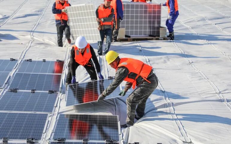 工作人员将770块光伏组件安装在浮体单元。受访者供图该实证项目是全球首个在离岸距离30公里、水深30米、极端浪高10米的“双30”海洋环境下研究和建设的漂浮式海上光伏工程实证项目,实现了风电、光伏同场发电,降低了工程造价和运行维护成本,为未来海上光伏实现规模化、商业化、标准化探索技术路线,实现与产业链的价值共生。
