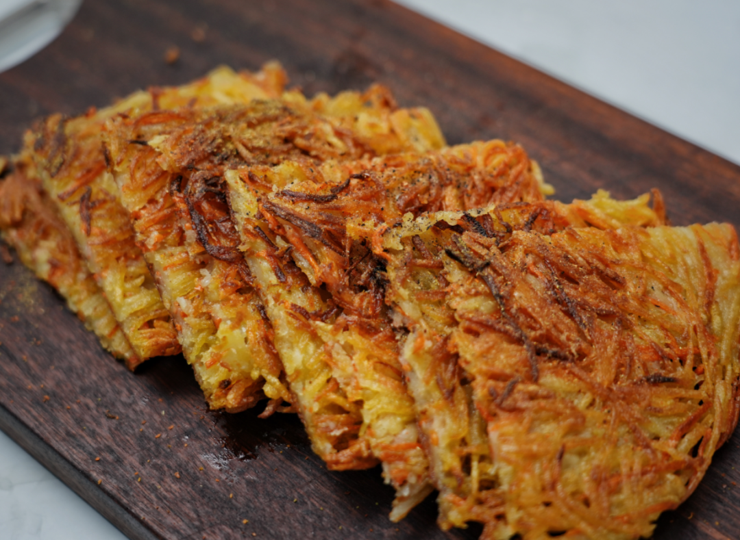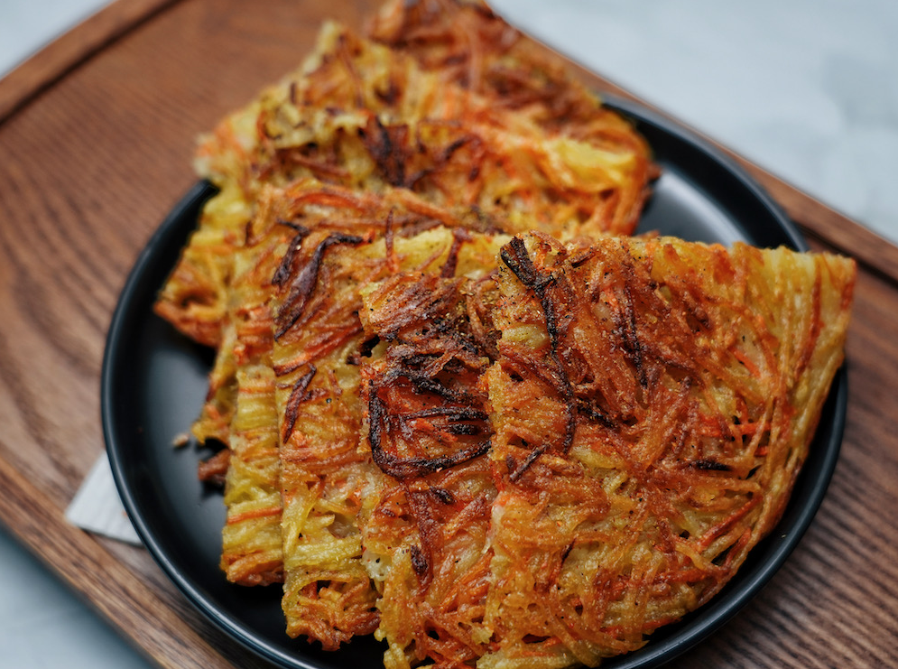 土豆1斤,胡萝卜1根,玉米淀粉小半碗,面粉2小勺,孜然粉、黑胡椒、辣椒粉和盐适量。① 土豆和胡萝卜削成丝,用少许盐抓一下,再加淀粉和面粉抓匀,均匀就可以,不用抓太久。② 不粘锅里多倒一点油,油稍微热就可以。先把土豆丝铺平,用转中小火慢煎,煎到边缘的土豆丝变脆,再翻面煎到两面成型。