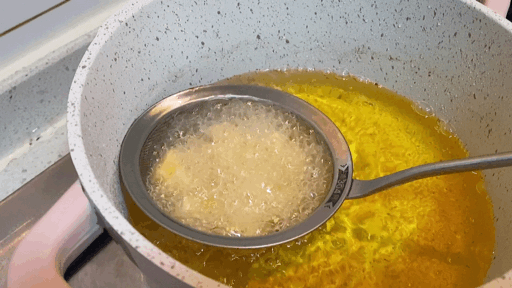 温170℃左右,用漏勺盛一勺红薯丁,炸到红薯变色成型。
