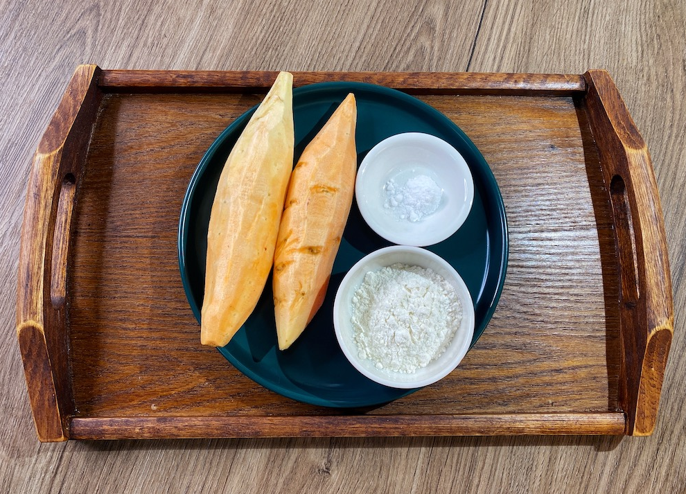 红薯洗干净,用小刷子把脏的地方刷一刷,然后放在盐水里泡30分钟,再洗一遍。