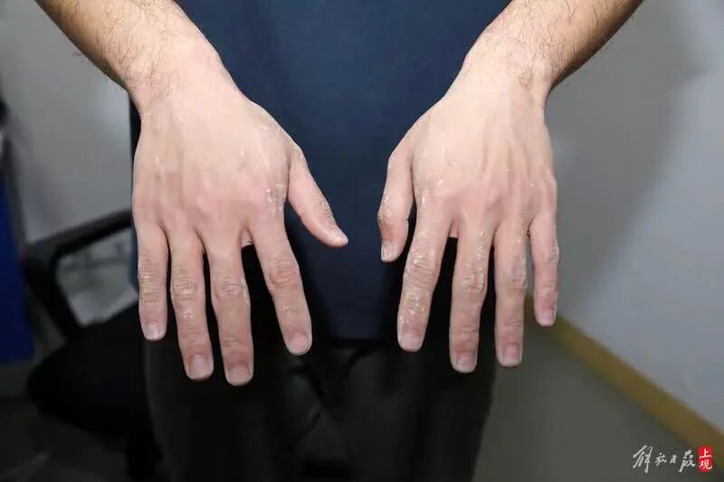 一场核酸检测开展完毕,汗水将屈煜的手浸泡到起皮