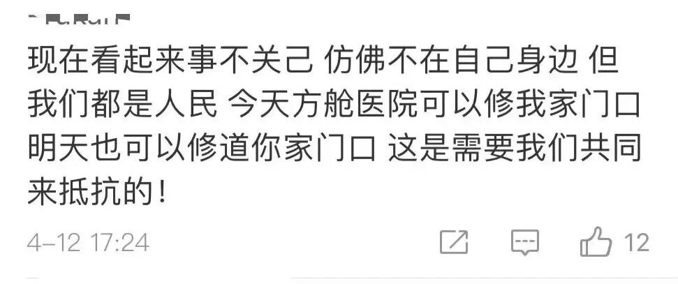 “现在看来事不关己,仿佛不在自己身边,但是别忘了,今天方舱医院可以修在我家门口,明天也可以修到你家门口。”
