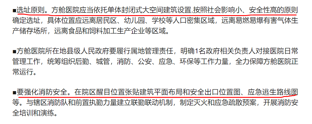 方舱医院应当依托单体封闭式大空间建筑设置,按照社会影响小、安全性高的原则确定选址,具体位置应远离居民区、幼儿园、学校等人口密集区域等……