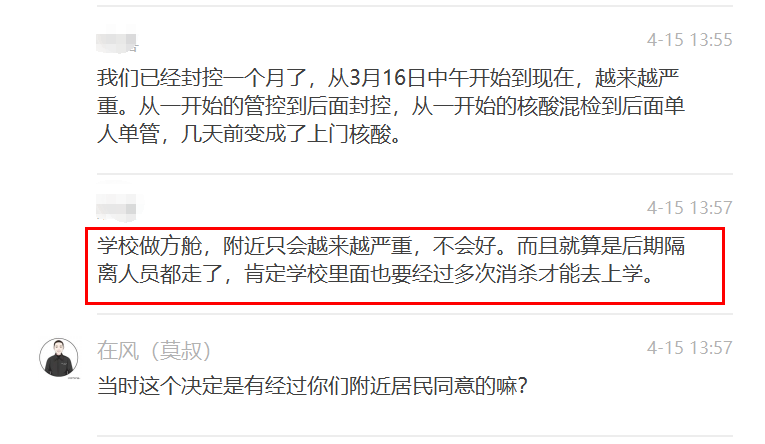 正如那位南昌同样境遇的读者一再跟我强调的:“居民区附近学校真的不能用做方舱。”——大家的担心并不是没有道理的。