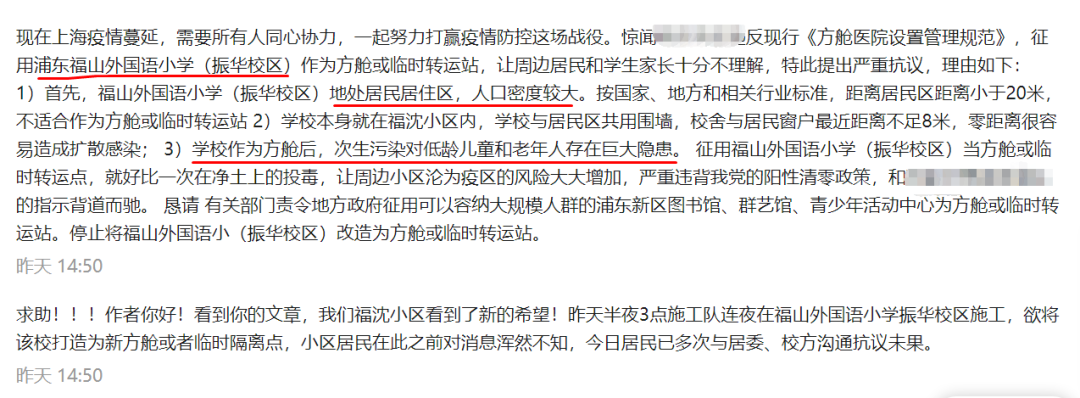 但由于个人能力有限,这是我最后一次为“居民区附近学校建方舱”的求助者们发声了,还请各位热心人士了解之后,也帮忙为他们转发一下!