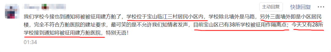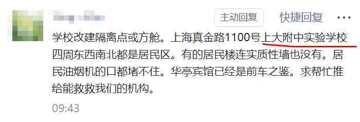 “学校位于宝山临江三村居民小区内。帮帮我们吧!学校除了北墙外是马路,其他三面墙都是小区居民楼,目前宝山区已有38所学校被征用为隔离点!今天又有28所学校接到通知将被征用建方舱!太无语了!”