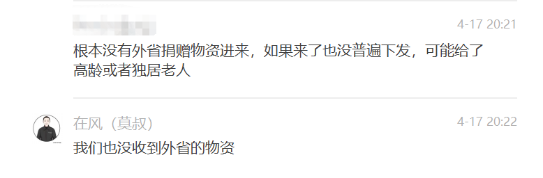 “根本没有外省捐赠的物资进来,如果来了也没普遍下发,可能给了高龄或者独居老人。”