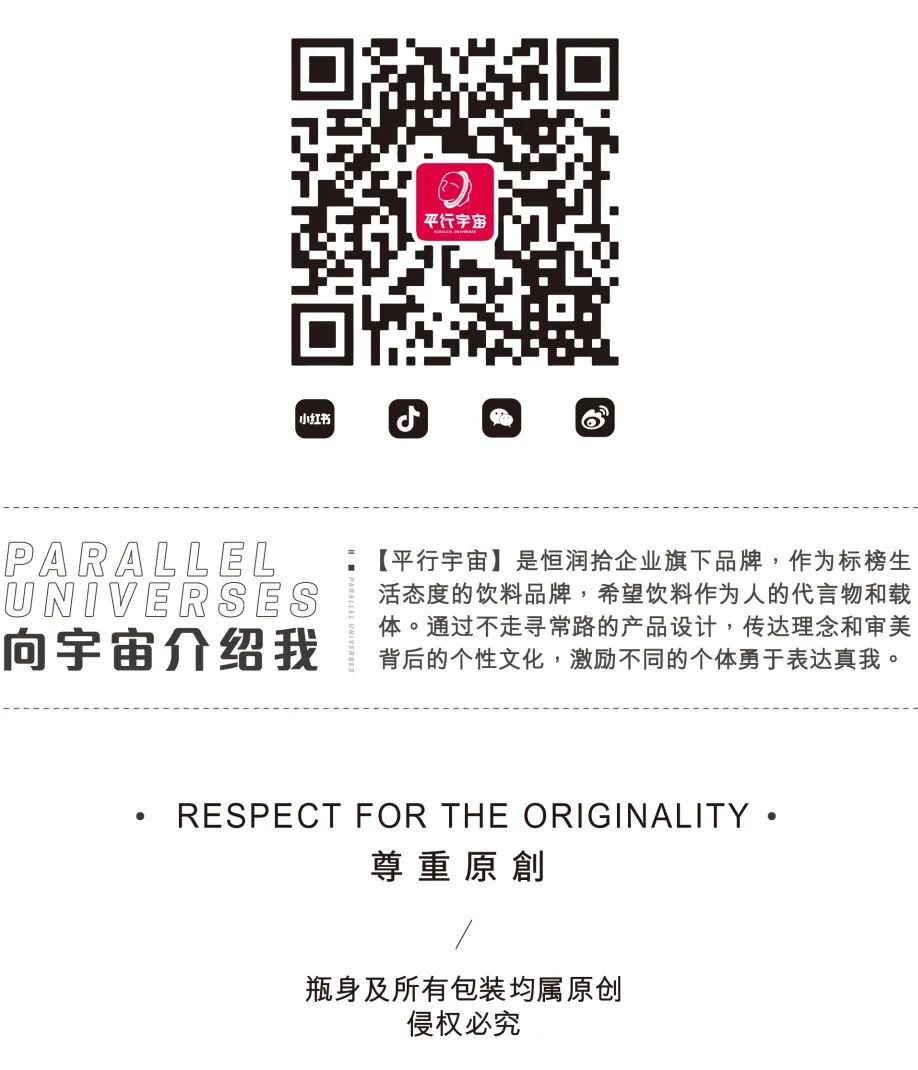 功能介绍 【平行宇宙】作为标榜生活态度的饮料品牌,希望饮料作为人的代言物和载体。通过不走寻常路的产品设计,传达理念和审美背后的个性文化,激励不同的个体勇于表达真我。*请节制饮酒;未成年人请勿饮酒;请勿饮酒驾车!