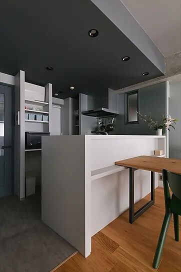餐厅区域也非常简单,直接是一个桌子连接着开放式厨房的吧台部分,这样餐厨的动线也很方便。