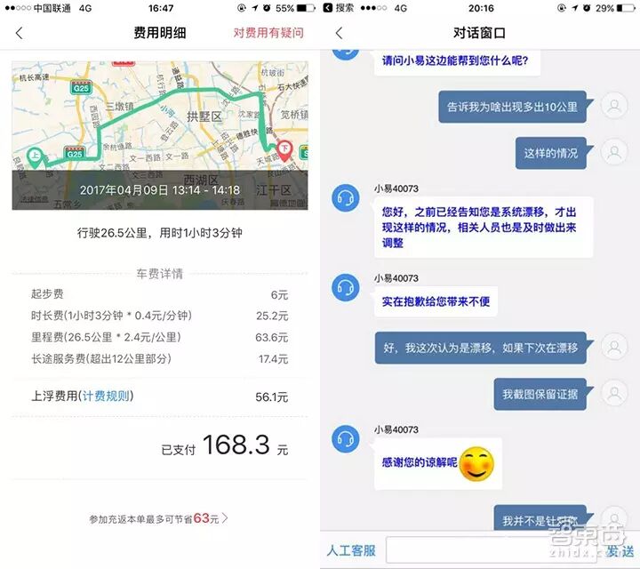 不过,这些例子虽贵,但都是明码标价且顾客自己也知情的。杭州的汤先生则在4月9日遭遇了一次诡异的“里程漂移”事件。他在结束用车过后,发现平时25、6公里长的路线变成了38公里,打车费飙升到230元。用地图软件确认过路程只有20多公里后,汤先生向易到客服发起了申诉,得到的答复是“系统漂移”,随后计价被修正为168元。但这个回答并未令汤先生满意,经计算,多出来的11.5公里路程的计费和最后“虚高”的62元费用并不对应。汤先生认为后台有人在故意修改最终计价,而易到方面否认了这种可能。