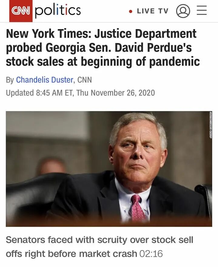 2014年首次当选参议员的珀杜,是奥索夫的竞选对手,他在2020年1月24日参加了参议院有关新冠病毒情况的闭门简报会议。就在当天,获取了新冠病毒疫情的珀杜,买进了杜邦公司6万5千美元的股票。此后的几个月,参议员珀杜分别买进和卖出了价值数百万美元的股票。据《纽约时报》11月25日报道,联邦司法部就此案展开了对珀杜的调查。就在自己暗中谋取私利的时期,珀杜支持共和党动议,试图在疫情期间废除奥巴马医保。若论与特朗普的政治关系,参议院的投票记录显示,珀杜是特朗普的强力支持者。