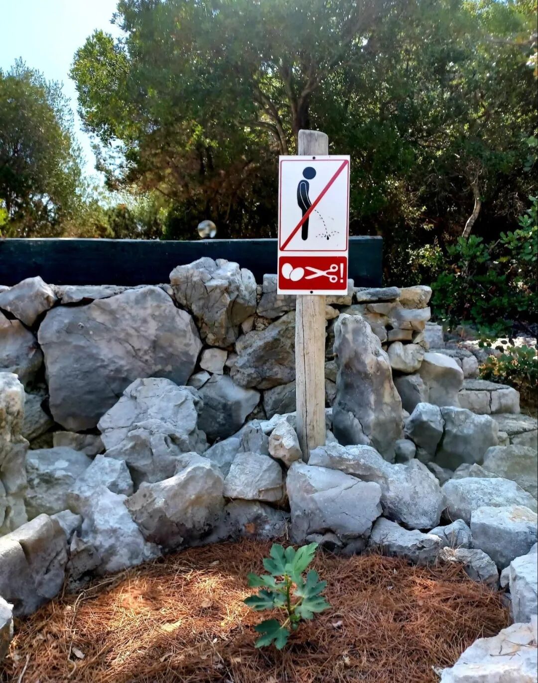 Korcula 岛上有克罗地亚最好的海滩,我们的旅舍位于这条形似鳗鱼的岛屿腹底,一枚水滴状的微岛挂在旅舍所在的崖边,躺在树荫下的吊床上,夏日午后的小微风吹进了心里。令人莞尔的是,微岛上的一个标牌完美地诠释了什么叫"尽在不言中"。