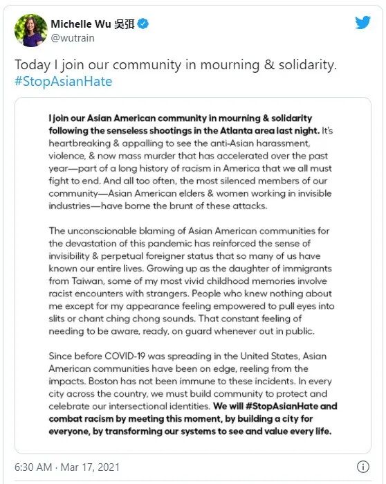 支持者认为吴弭正是波士顿此刻所需要的人选——历史上推动1903年波士顿移民突袭事件的种族主义势力再次抬头,当时移民官员至少逮捕了234名美籍华人,其中绝大多数是波士顿合法居留者。而今天,有着70万居民的波士顿,2021年第一季度发生反亚裔仇恨犯罪与去年同期相比猛增了60%。亚裔被吐口水,轮胎被划破, "滚回你的国家 "这样污言秽语和反亚裔涂鸦不时出现,受攻击案件激增,亚裔企业也蒙受损失。