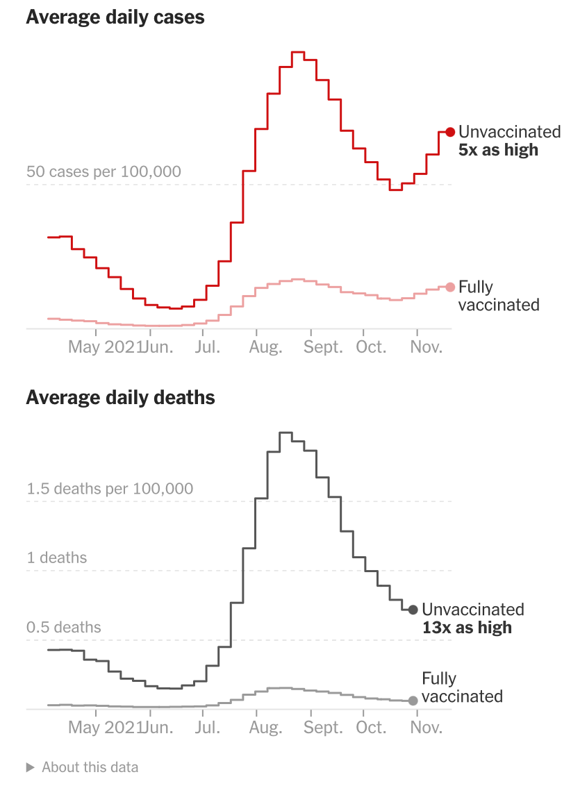 纽约州与其他26个州,接种疫苗与没有接种疫苗者,每天平均感染病例与死亡率对比:没有接种疫苗的人当中,每10万人有50例病例,是完全接种过疫苗的5倍。死亡统计:没有接种疫苗者当中,每10万人有1.5人死亡,尔完整接种疫苗的人只有0.11人死亡,前者是后者的13倍。