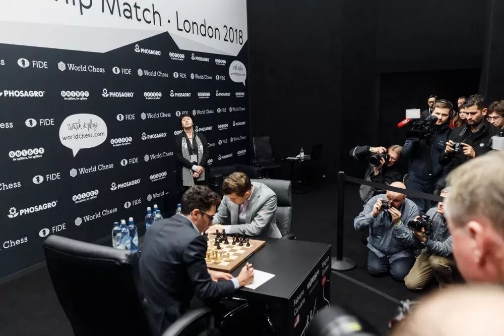北京时间11月23日凌晨,2018年世界国际象棋冠军赛第10轮争夺在伦敦结束,挑战者美国棋手卡鲁阿纳执白再度弈和棋王挪威棋手卡尔森。