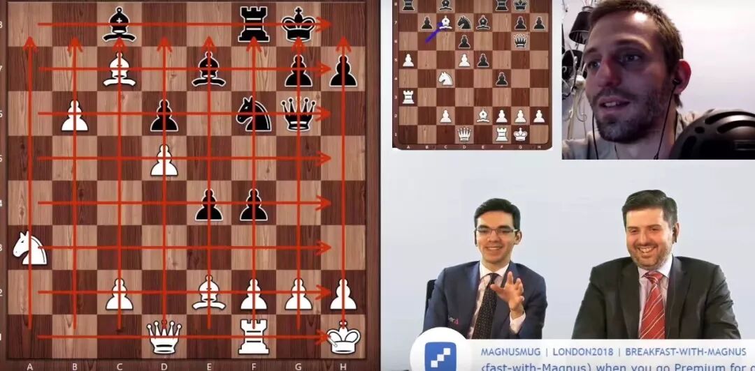 中局一度进入混战,在荷兰特级大师吉里和俄罗斯特级大师斯维德勒的直播讲解中,他们为双方的计划画出了非常抽象的蜘蛛网图。