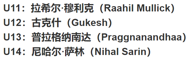 值得注意的是,古克什的成功绝非偶然。近几年,印度国际象棋在国际象棋后备人才培养方面硕果累累。每年的世少赛,印度小棋手摘金夺银,早已不是新闻。你相信吗,上面这张照片中有四位“世界第一”!他们都是目前国际象棋等级分各年龄组的第一人,而且全都来自印度!从左至右,分别是: