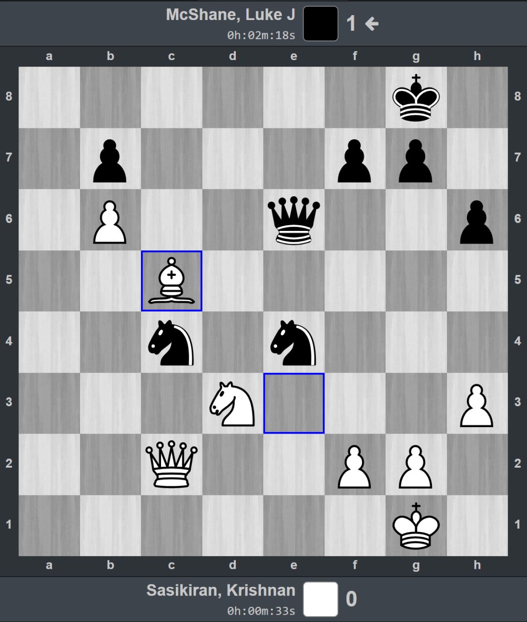 本题局面来自2019国际象棋世团赛第五轮,印度队萨斯基兰与英国队麦克肖恩的战斗。图中,执白的萨斯基兰刚刚用象吃掉了黑方的 c5 兵,不料此兵有毒 (⊙o⊙)…