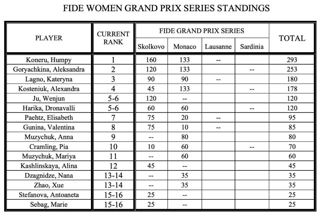 科内鲁以293分高居榜首。戈尔亚奇金娜紧随其后。拉戈诺和科斯坚纽克暂列第三和第四。棋后居文君只参加了一站比赛,获得亚军,暂列第五名。