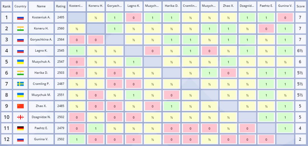 11轮单循环比赛过后,有三名棋手同积7分,并列积分榜第一集团,分别是俄罗斯棋手科斯坚纽克和戈尔亚奇金娜,以及印度棋手科内鲁。