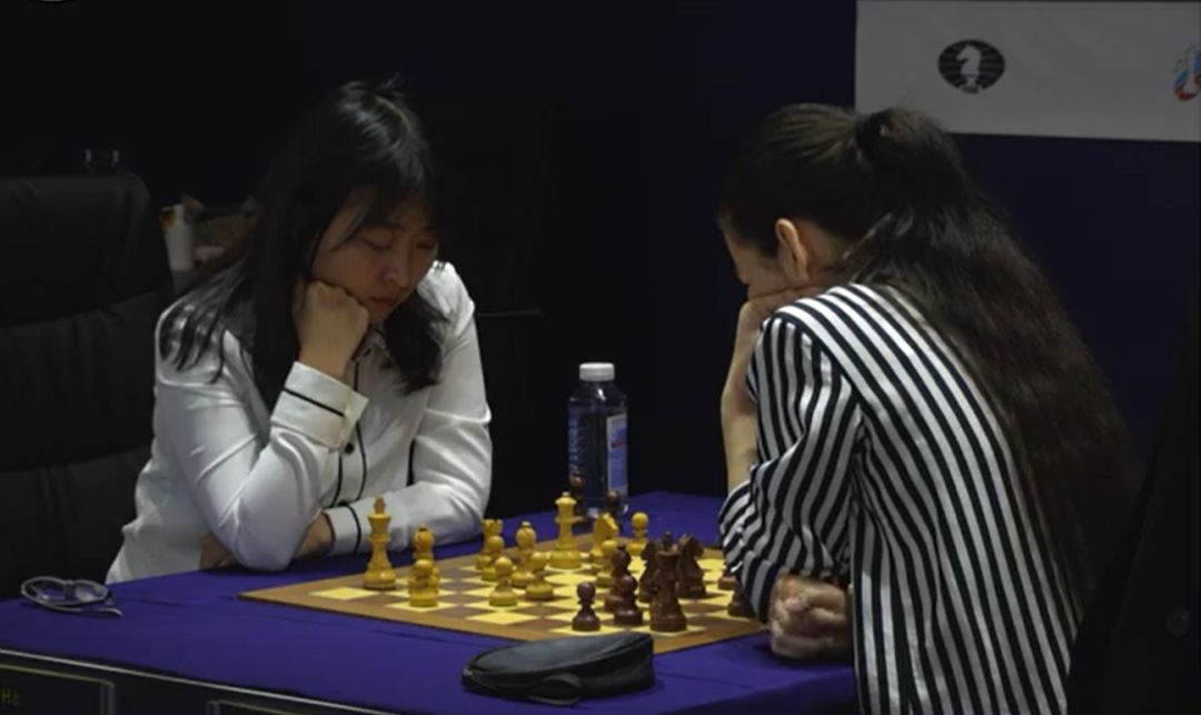 第四盘,背水一战的挑战者戈尔亚奇金娜弃兵抢攻,给居文君施加了不少压力。只需和棋即可卫冕的居文君,耐心地进行防守,最终成功取得和棋。