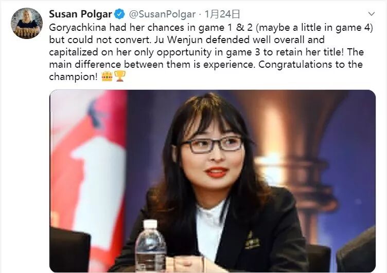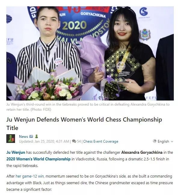 1月24日晚,除夕之夜,从俄罗斯符拉迪沃斯托克传来捷报,在2020女子国际象棋世界冠军对抗赛的快棋加赛中,居文君1胜3和赢得最终胜利。居文君历经长达20天(12盘慢棋、4盘快棋)的艰苦较量后,终于在中国农历大年三十这天通过加赛,以总积分8.5比7.5击退了挑战者俄罗斯“天才少女”戈尔亚奇金娜,第三次荣登世界棋后宝座!这也是国际象棋历史上,对抗赛制世界冠军赛第一次出现靠快棋加赛争夺冠军的情况。