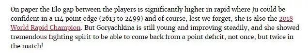 Chessbase在新闻中点评道:“居文君的快棋等级分比戈尔亚奇金娜高出114分,居文君还是2018年世界快棋锦标赛冠军。但是,戈尔亚奇金娜的最大优势在于她很年轻,处于稳步上升期,而且拼劲十足。本次对抗赛中,她两次在积分落后的不利形势下,将比分扳平!”