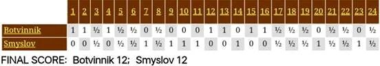 就像对Bronstein的比赛一样,Botvinnik再次以12:12的平局保住了棋王头衔。巧合的是,第24局比赛也是只有22回合的平局。