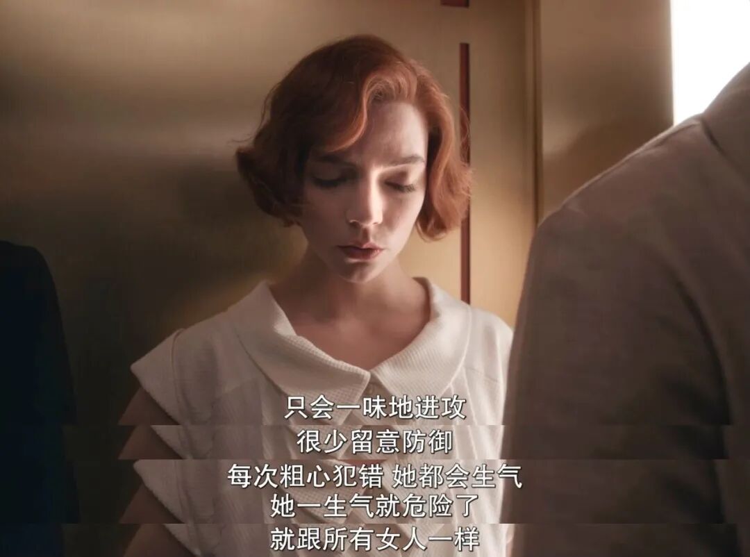 而《女王的棋局》做得极棒的一点是:即便是不懂国际象棋的人,也不会对剧中一场又一场的象棋比赛感到枯燥。剧中的每盘棋都由国际象棋顶级大师亲自设计,不过就算棋手们不断抛出大量陌生术语,我们仍能看得津津有味,并将其视为每一集的高潮点。因为除了棋盘,镜头更多是在角色的反应中切换。根据围观群众的表情,我们能读懂目前局势是否胶着,而透过对阵棋手的微表情,则能推测双方走每步棋的心理。尽管表面上是下棋,观众却一直在解读双方的心理战,而且借助眼花缭乱的剪辑,一盘棋甚至有了交响乐般的节奏感。这么一来,对于多数观众而言,国际象棋被抽象化了,它最终代表了一个大家都想要赢得的东西。我们希望在女主身上看到天赋被施展,就像看到生活中的自己,这种代入感极为强烈,似乎每个人手中都有一盘棋。安雅·泰勒-乔伊扮演15岁之后的贝丝·哈蒙,其实跨度不小,加上关键情节里她都在静坐,每一盘棋中的微表情都会被无限放大。在特写镜头下,她不仅要用表演拖拽剧情微妙的转折,还要保持对观众的吸引力。她用面部表情向观众曝露着角色的每一个心理动作,思考、犹豫、悲伤、胜利、失败、不甘、得意、复仇、怜悯……一双闪烁的眼睛和抽搐的嘴唇,仅仅依靠特写镜头全部完成,真的太难了。而在棋盘之外,贝丝·哈蒙的独处生活也是被着重叙述的,她可能独自在家,在陌生人的公寓里,在飞机上,在旅馆中……这是一个非常立体的角色,极易被观众共情。但是,《女王的棋局》的核心冲突并不是贝丝·哈蒙对抗一个低估她并抛弃她的世界。