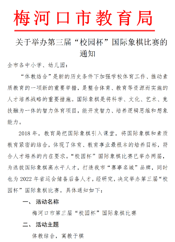 自2018年起,我市教育局把国际象棋引入课堂,将国际象棋和素质教育紧密的结合,体现了体育、教育事业最根本的培养目标,符合人才培养的要求,成为全国体教结合的典范。