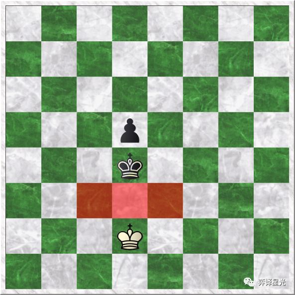 如图一,我们知道,这个局面轮到谁走谁将陷入劣势,实际上是关于兵的升变关键格(c3\d3\e3)的争夺的问题:黑王可以进入这三个格之一,则兵必然能够升变,如果进入不了,兵无法升变作和。