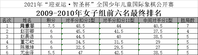 在有239人参赛的2009-2010年组比赛中,孔祥睿、孟奕涵、魏建州、周奕宸、沈旭升、李昊宇、于添喜、焦兆瑞、赵瑞泽、陈智远、尤墨、杨思源、祝陈希、夏北辰、杨润泽、龚孙乐获得本组男子前16名,拿到线下总决赛入场券。周雅菲、赵芸卿、赵晨语、董芯屹、陈雅坤、尤金泽获得女子前6名,也晋级线下总决赛。值得一提的是,女棋手周雅菲在男女总成绩中,排名本组第三。