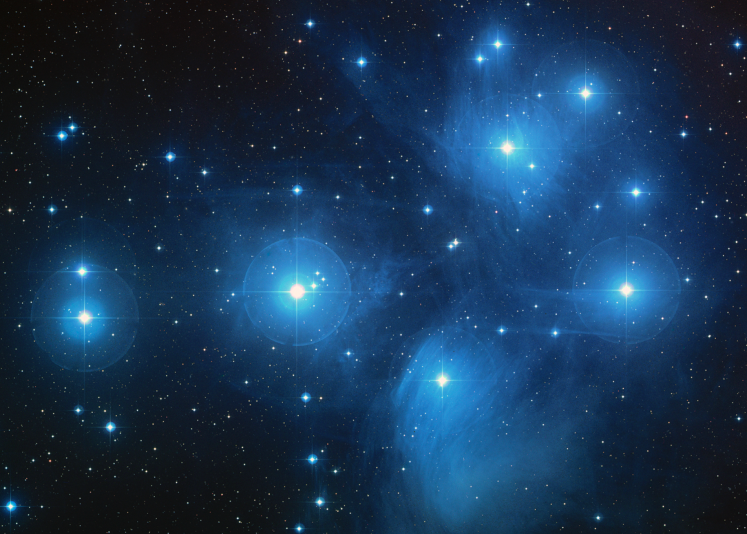 著名的疏散星团:昴星团(在西方又称“七姊妹星”,是夜空中肉眼可见的疏散星团,明亮的蓝色气辉代表着它十分年轻,仅有数千万年的历史,图片来源:HST)