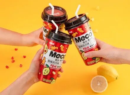 据Meco蜜谷果汁茶官方微信发布的消息,Meco近日与百草味合作,推出了联名新品“怪怪茶”,口味为酸辣凤爪味。目前已上架天猫meco旗舰店。
