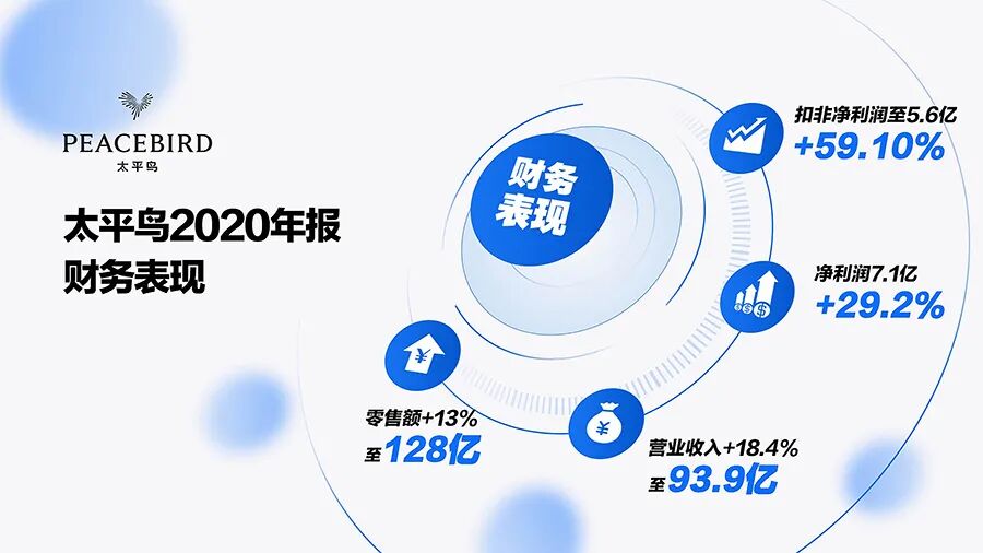 3 月 29 日,太平鸟官方发布了 2020 年财报,太平鸟2020年营收93.9 亿,同比增加 18.4%;归母净利润为7.1 亿,同比增加 29.2%。其中线上渠道营收28 亿,同比增长 21%,占总销售额比例提升至 30%以上;线下直营营收最多为41 亿,同比增加 21%。